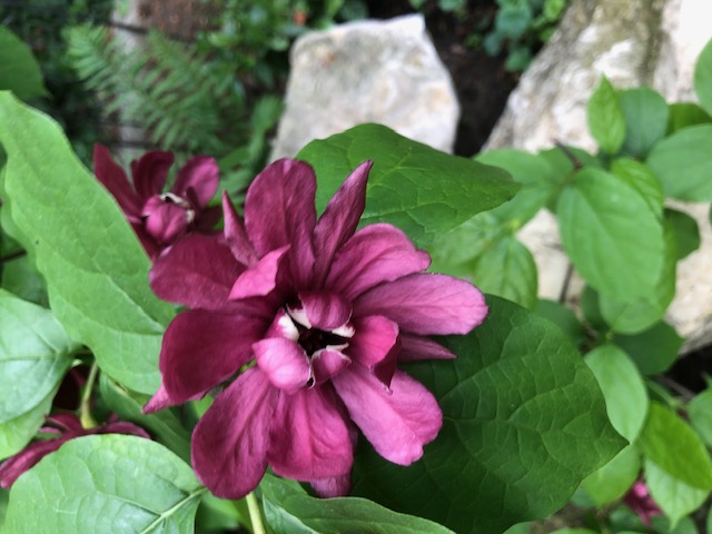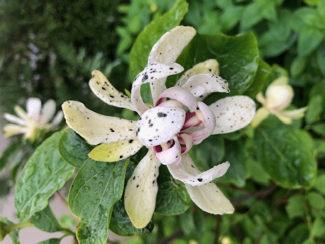 Ez egy Calyganthus 'Venus'. Évek óta megvan, szépen fejlődik, szeteti a helyét, nem volt még gomba, vagy rovar okozta betegsége. Szórt fényt kap. Minden virágzáskor ezeket a fekete pöttyöket látom, amelyek víz hatására nyílás után fokozódnak. Az interneten azt találom, hogy nincs kártevője. Azok az emberek akik találkoztak a pettyekkel, nem találták meg az okot. Állatot, pókhálót nagyítóval sem látok. Kapott februárban lemosót. Bimbós állapotában kapott jócskán Compo Triathlon rovarölő permetet. Pedig úgy néz ki mintha valami kis atka megszúrná, és a seb befertőződne. A 'Hartlage Vine' teljesen probléma-mentes. Bosszant, hogy nem tudom mi a baj. Olyan gyönyörű növény és rengeteg virágot hoz évről évre. Mit tehetnék?
