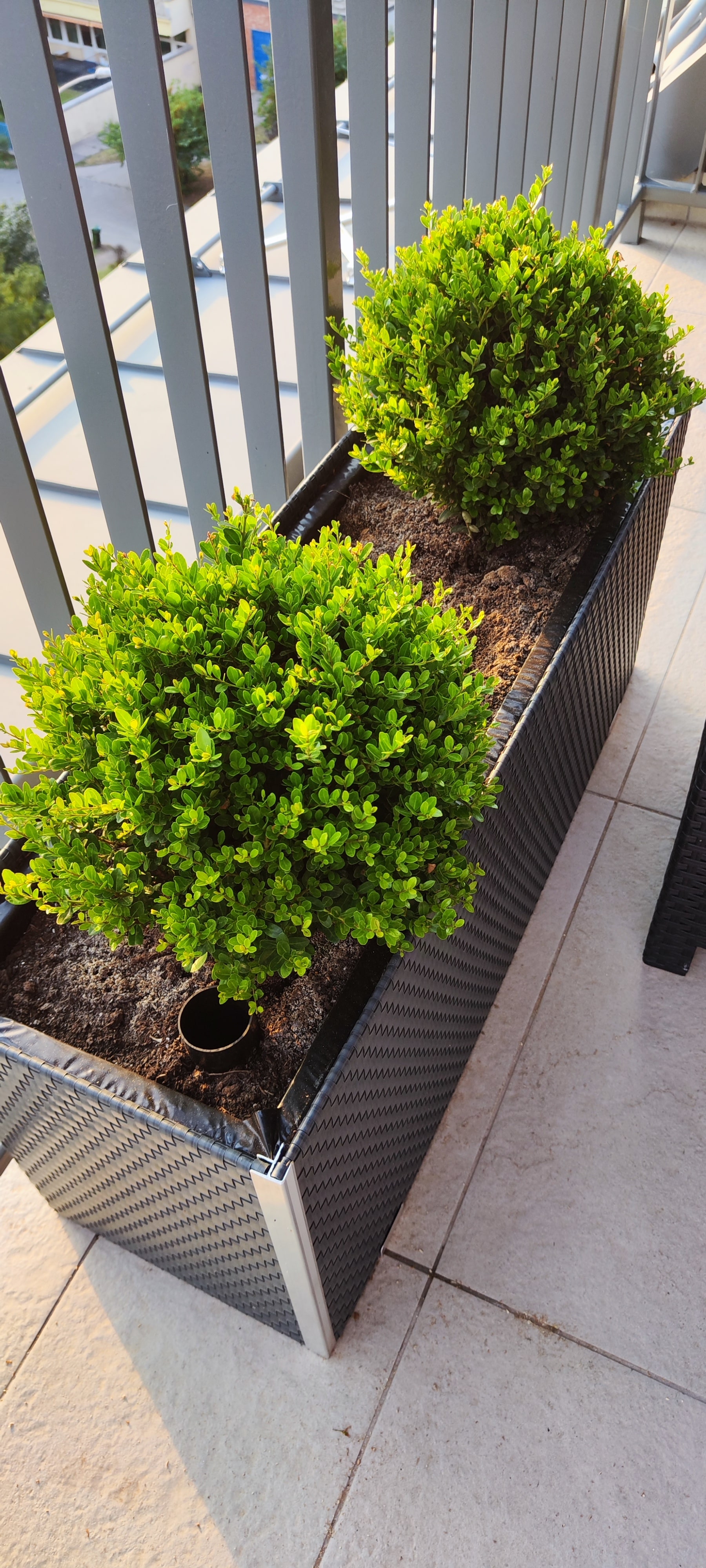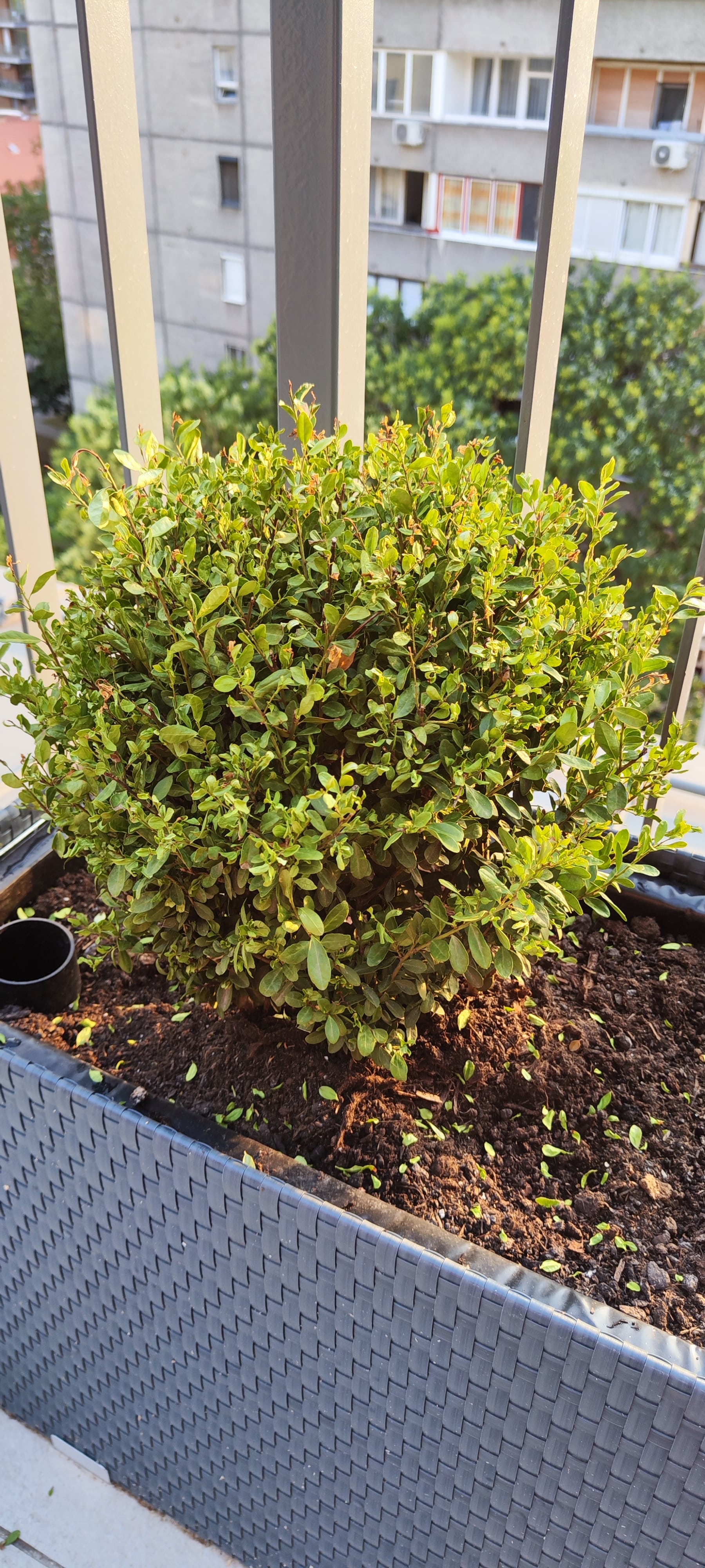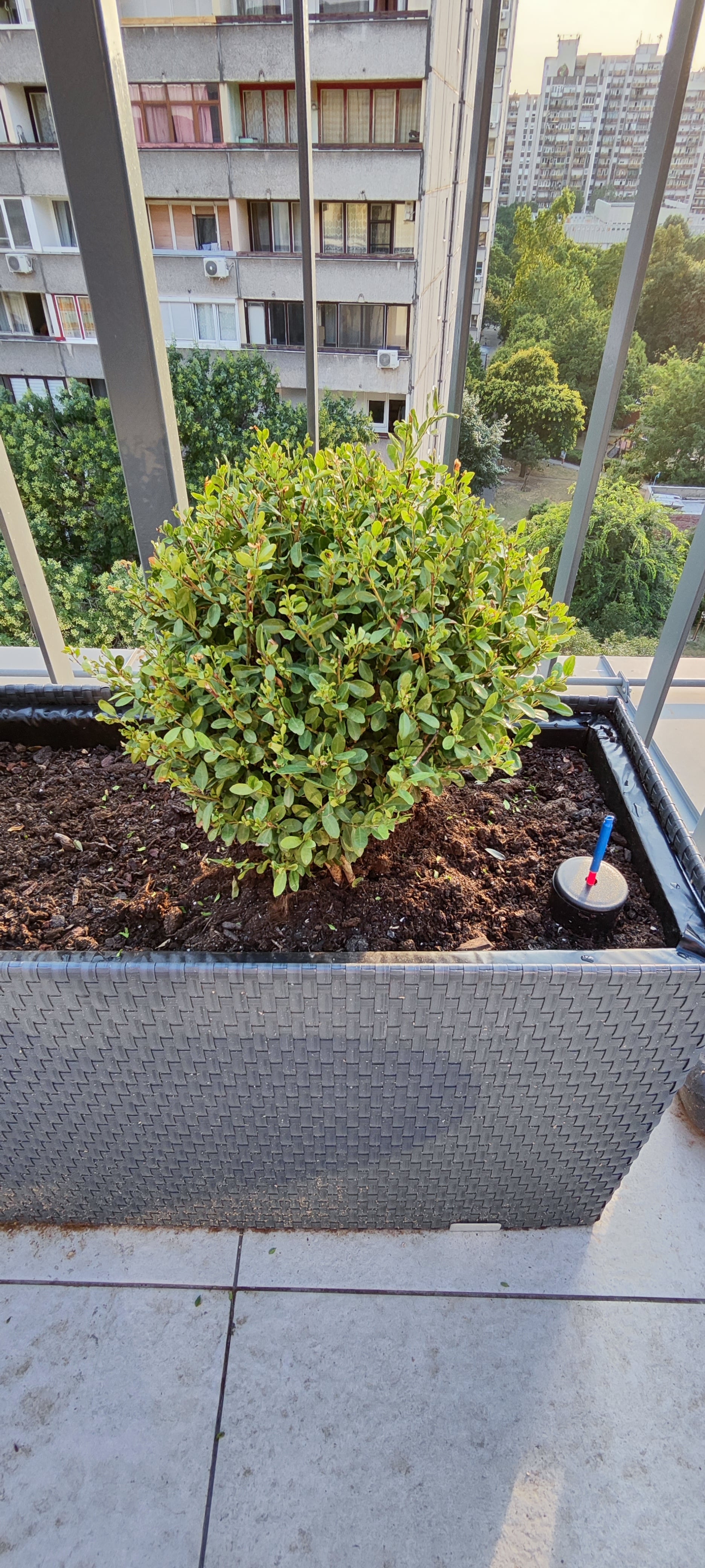 3 hete vásároltunk IKEA-ban csipkésszélű magyalt, amit másfél hete ültettünk át a konténerből nagyobb balkonládába.